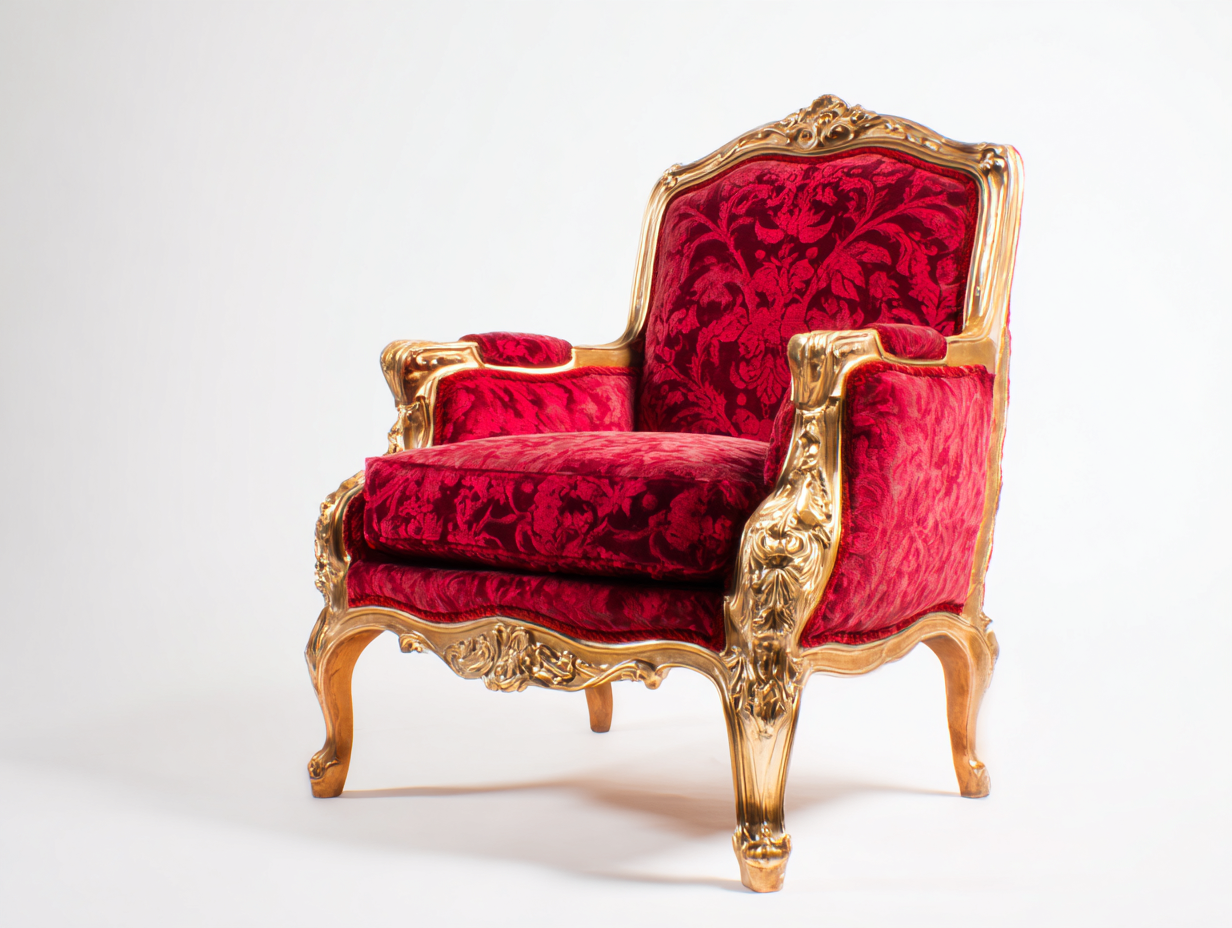 Der Sessel ist mit einem Samtstoff in roter Farbgebung bezogen. Die Oberfläche wirkt weich und edel. Das tragende Gestell besteht aus Holz mit goldfarbener Oberfläche und kunstvollen Schnitzdetails, die für Stabilität und eine hochwertige Optik sorgen.